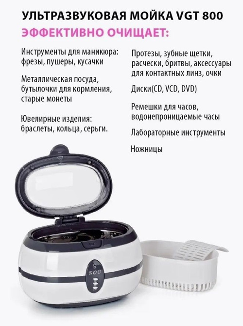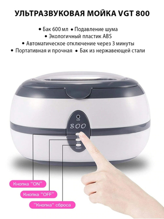 VGT-800 este un sterilizator și aparat de spălat cu ultrasunete conceput pentru curățarea și pre-dezinfectarea diverselor obiecte. Este utilizat în saloane de înfrumusețare, unități medicale și acasă pentru curățarea obiectelor precum instrumente de manichiură, bijuterii, ochelari de vedere, instrumente dentare și proteze dentare. Dispozitivul funcționează la 35 W, 40 kHz și dispune de un cronometru încorporat de 3 minute. Rezervorul său conține până la 600 ml de lichid.